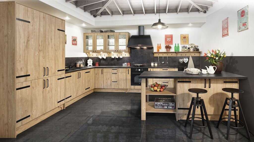 Оттенки серого, коричневый древесный или черный цвета часто используются в интерьере индустриальной кухни.