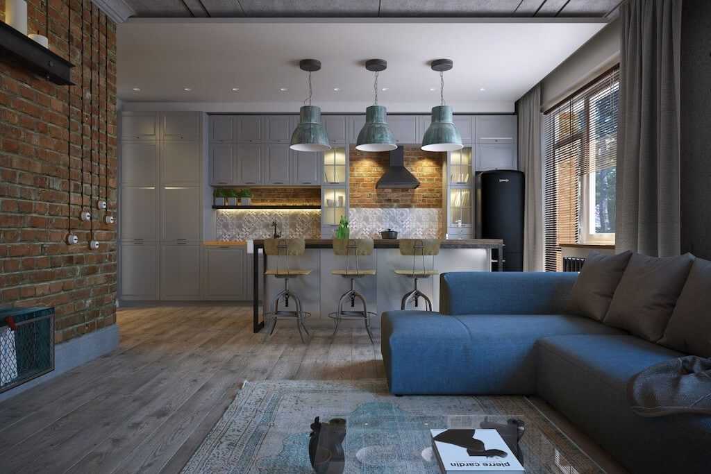 Дизайн кухни-гостиной площадью 18 кв. м. с элементами в стиле лофт.