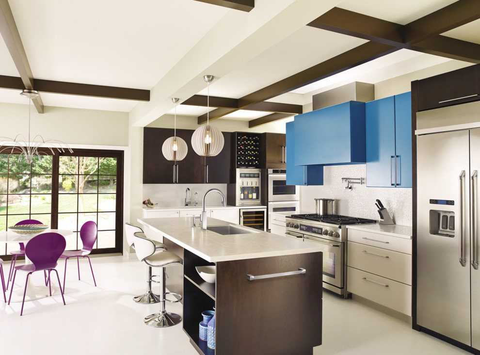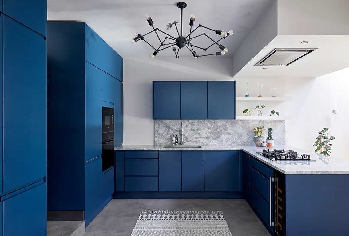 Синий. Также допускается использование любого оттенка – от небесного до глубокого синего. Это холодный цвет, поэтому используется в кухнях с окнами, выходящими на южную сторону.