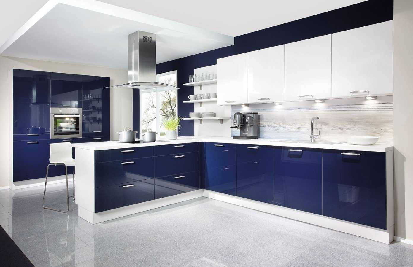 - Синий – еще один вполне применимый тон для кухонного пространства в стиле модерн. Этот цвет, как и зеленый, современный дизайн представляет обычно в глянце.