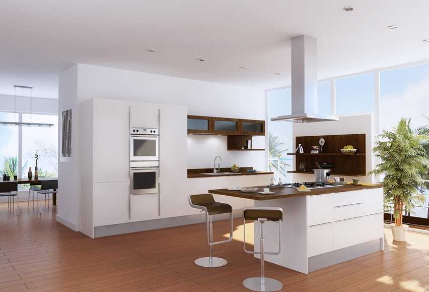Белый цвет отлично подойдет для маленькой кухни в стиле модерн. В сочетании с металлической фурнитурой, округлыми формами и стеклом получается элегантный дизайн. Чтобы кухня не была похожа на медицинский кабинет, добавляют деревянные элементы, яркий фартук или посуду. С белым фоном гармонирует темный или светлый деревянный гарнитур. А придать изюминки можно с помощью гальки, мрамора, выбеленного дерева, ротанга.