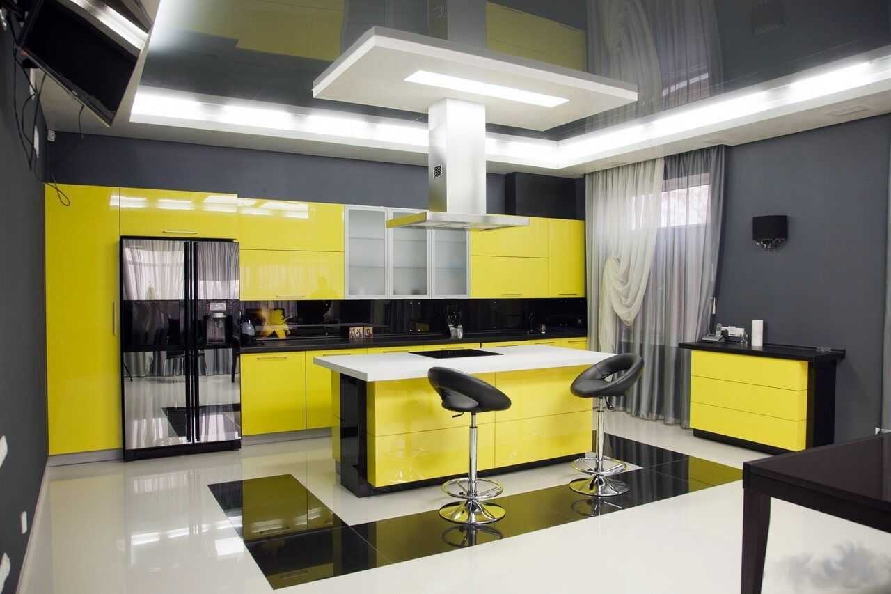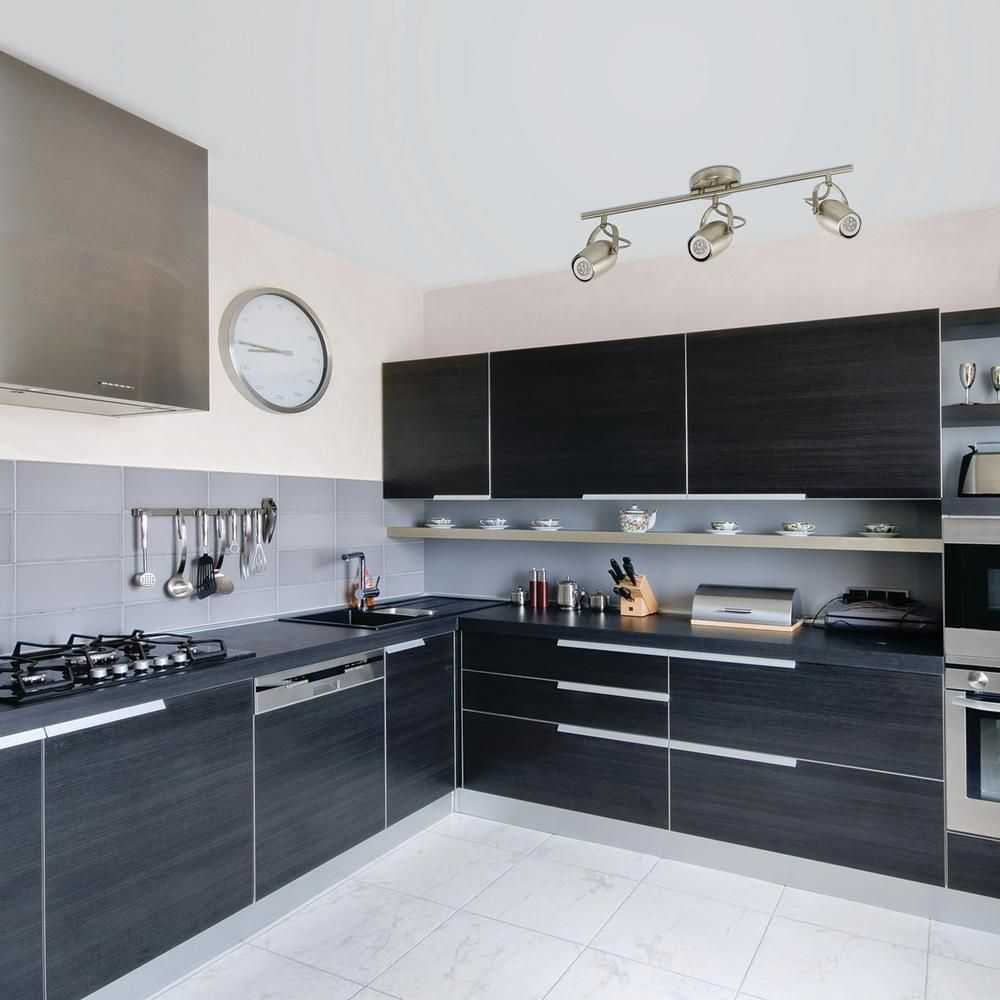 - Потолок: отличным решением будет монтаж натяжного потолка. Следует избегать сложных многоуровневых систем, а вот дополнительное освещение продумайте заранее. Красивые проекты на фото демонстрируют не только варианты для гостиной и спальни. Кухонное пространство также отлично подходит для натяжного потолка, только он должен быть качественным и прочным.
