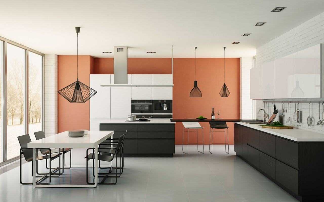 Идеальным для кухни в стиле модерн будут равномерно окрашенные стены нейтрального цвета. Под темной мебелью вы можете выбрать белый, бежевый, светло-серый оттенок, свет прекрасно вписывается практически в любую обстановку.
