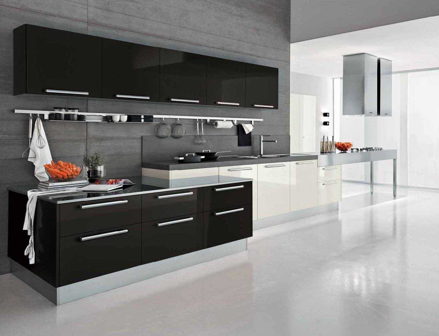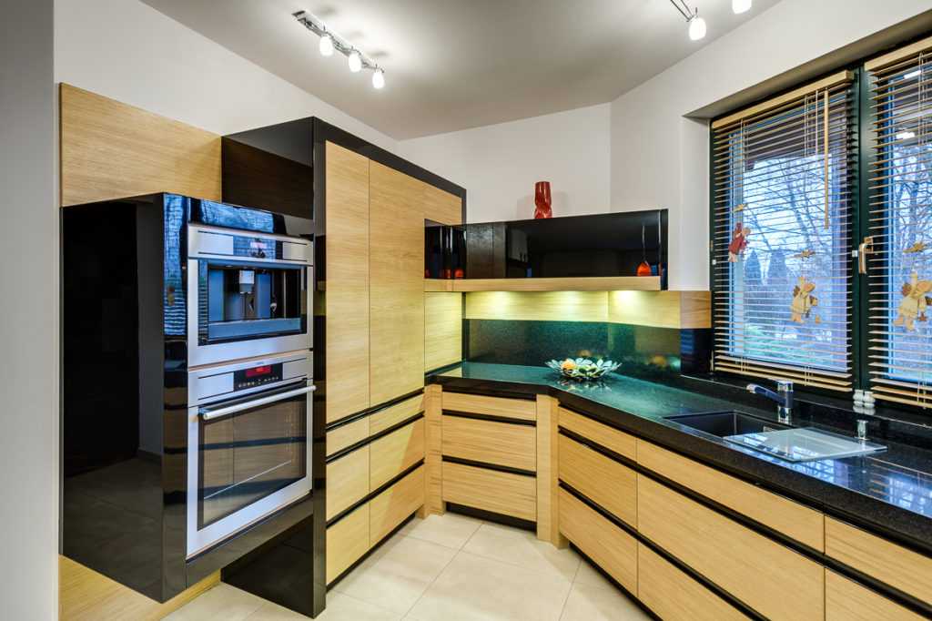 Черный цвет используется как основной, так и в сочетании с белым или контрастным, например, красным. Он хорошо подчеркивает сталь. Дизайнеры любят применять угольный оттенок в просторных кухнях. Фасады выполняются из дерева или выделяются яркими цветами – красным, желтым, оранжевым. Чтобы черная кухня в стиле модерн не выглядела слишком мрачной, в интерьер добавляют зеркала и подсветку.
