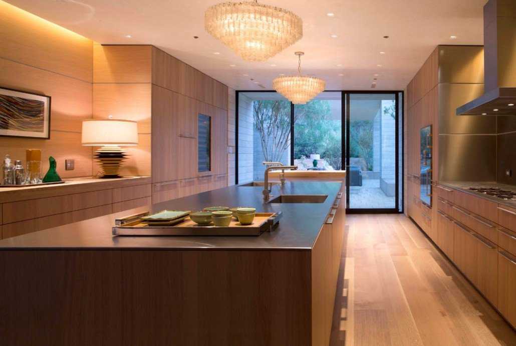 В модернистском интерьере эстетика освещения играет ключевую роль в создании правильного настроения. В этом случае интересная форма ламп, однако, несколько важнее, чем их способность выделять данное пространство. Светильники для кухни в стиле модерн имеют характеристики современного дизайна, то есть четкие геометрические формы. Чаще всего используются большие подвесные люстры, которые располагаются над обеденным столом.