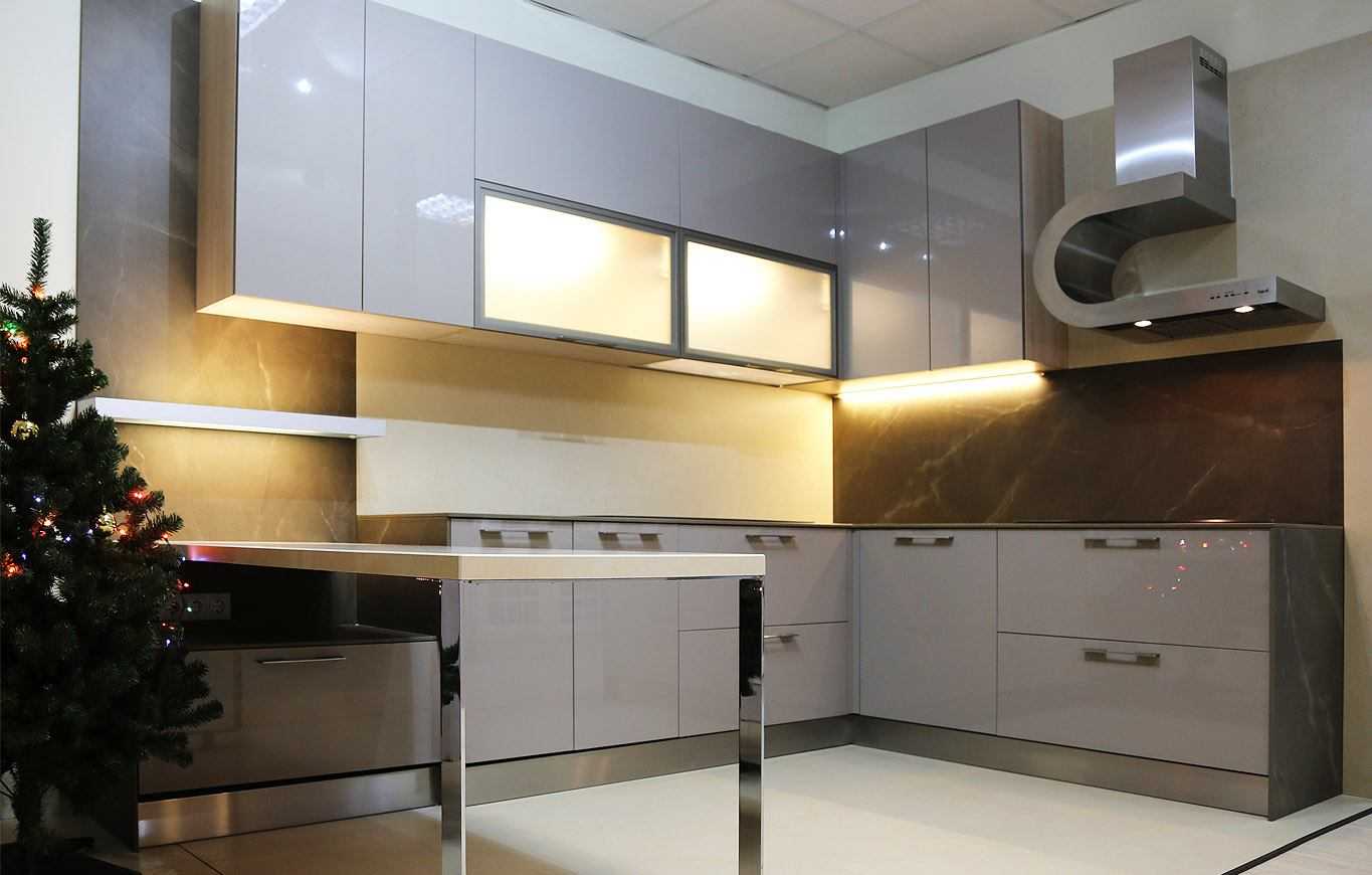 На заметку! С серой кухней в стиле модерн сочетаются хромированные или черные дверные ручки, а с теплым, бежевым — бронзовые, медные, позолоченные.