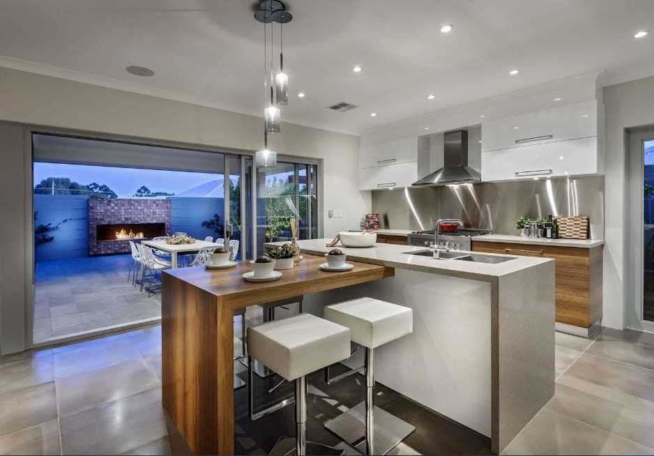 Освещение является ключевой особенностью открытой кухни, так как в ней больше пространства. Нахождение правильного баланса освещения, стиля и функциональности может стать проблемой, но если ориентироваться на три основных типа, такие как основное освещение, декоративное и рабочее, проблема исчезнет. Для создания основного освещения рассмотрите дорожку, которая опоясывает комнату или проходит через ее середину. Люстра или большой светильник может осветить пространство столовой. Рабочее освещение это отличная идея для раковины и зоны приготовления пищи. Декоративное освещение подойдет для верхних и нижних шкафов