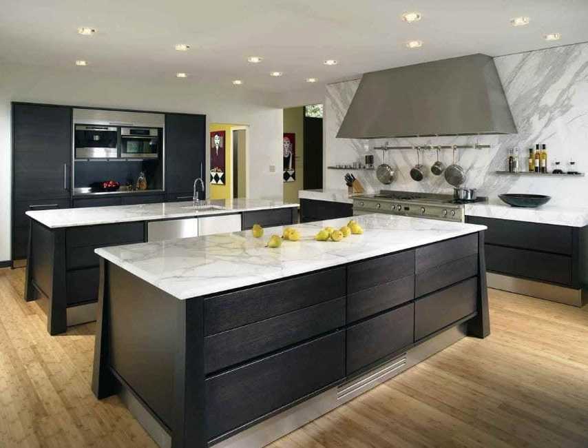 Особенность – акцент по центру помещения. Можно сделать там обеденную группу или диван, а также дополнительное освещение. В таком дизайне актуально будет смотреться ступенчатый потолок, мраморный пол, фартук черно-белого окраса и стулья в форме геометрических фигур.