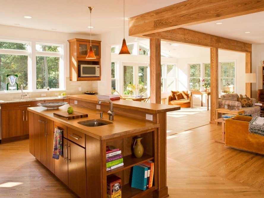 Дизайн и интерьер кухни в эко-стиле, совмещённой с гостиной, в частном доме подразумевает использование только натуральных и экологически чистых материалов. Цветовая гамма также достаточно спокойна, превалируют натуральные оттенки.