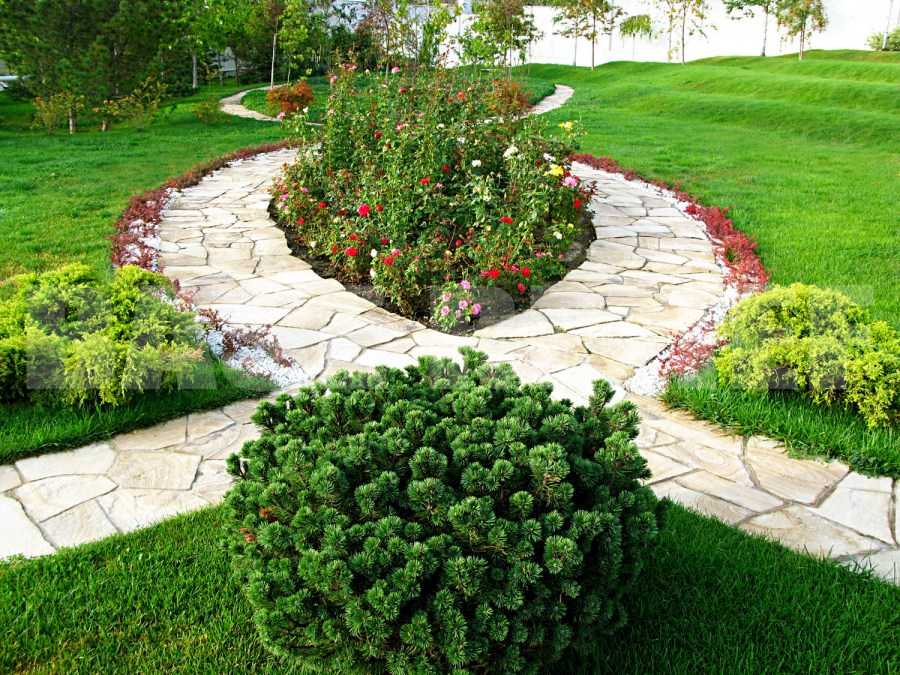 Обладателем северных склонов повезло больше. Здесь можно создать хвойный сад. В него будут включены деревья, кустарники и некоторые мелкие приземистые растения. Красивые туйки в форме треугольника на заднем плане отлично вписываются в общую обстановку дворовой территории.