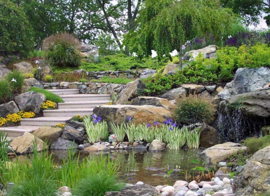 Большой популярностью при обустройстве дачного участка своими руками как в саду, так и на территории вокруг дома пользуется японский пейзаж. Он основан на использовании камней и воды. Им придается вид естественного природного нагромождения, но выполненного с определенной идеей или задумкой. Оригинально смотрится возле бассейна или другого искусственного водоёма.