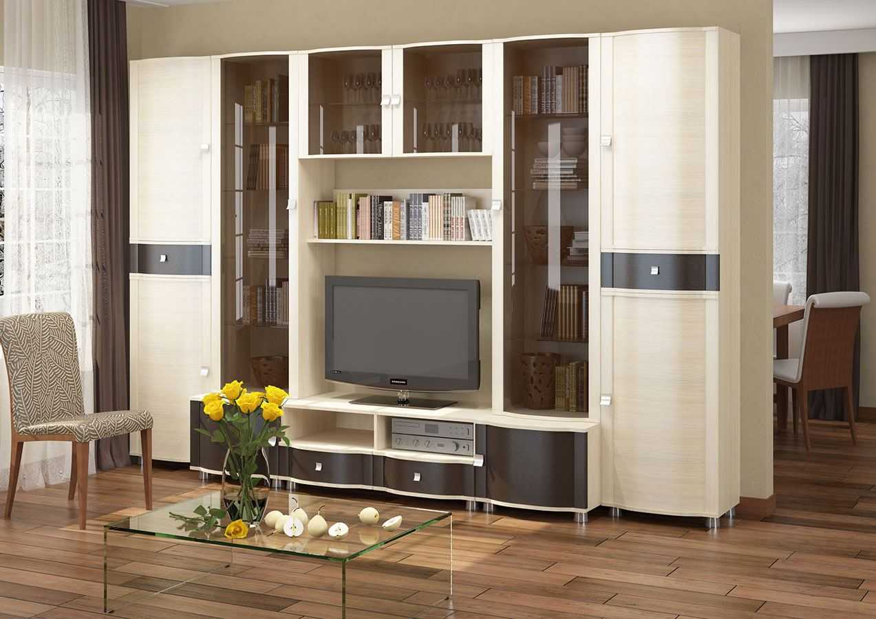 Угловая – стена в гостиную с угловым шкафом является вариантом самым популярным. Как правило, угол в помещении не используется, однако угловой модель позволяет это сделать. Обычно он является стационарным, но существуют и модульные варианты.