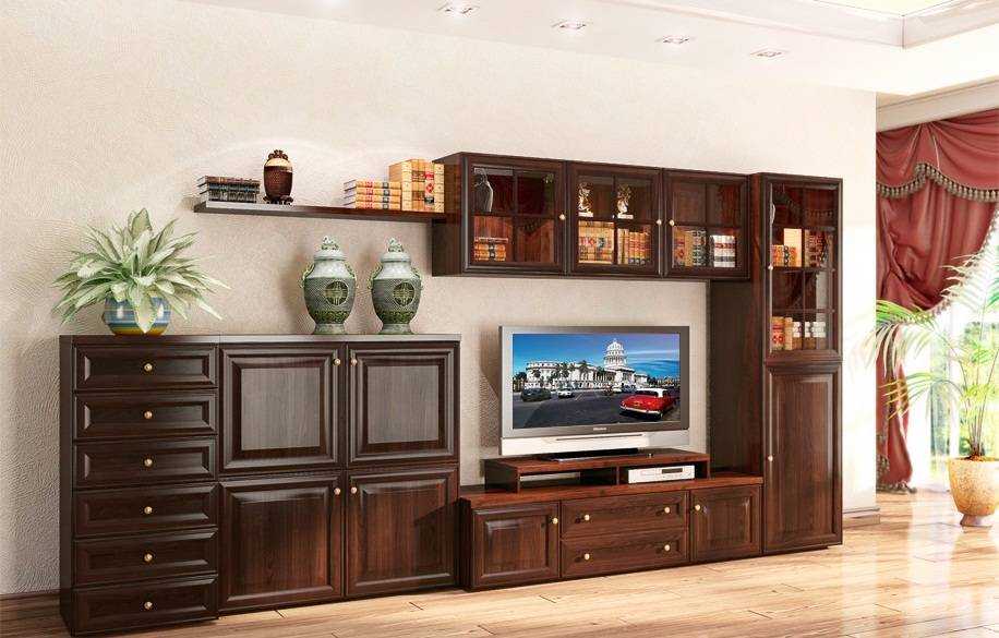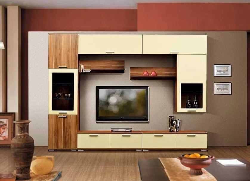 Расположение элементов стенки определяют внешний вид гостиной, ведь это самая «крупная» мебель в зале. Вариантов здесь немного.