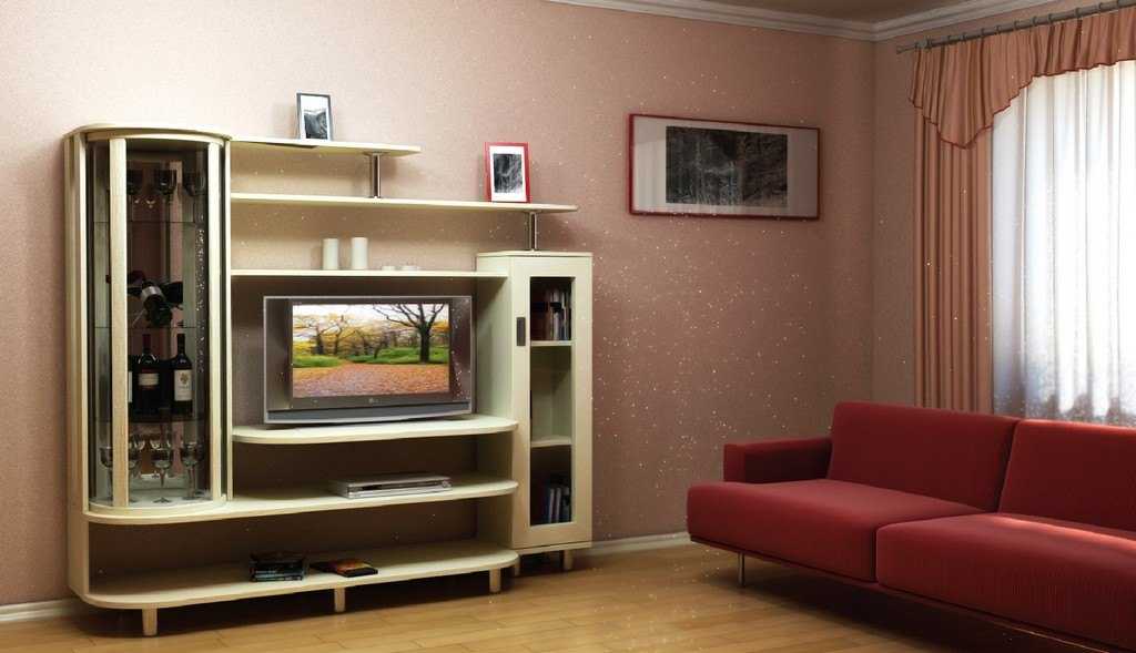 Конфигурация предметов также напрямую зависит от параметров гостиной. Для маленьких комнат подходят угловые модели, которые сами по себе являются вместительными и компактными.