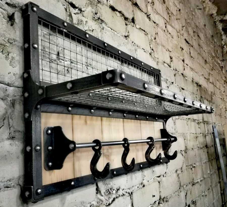 Ещё более грубый, но самобытный вариант вешалки для «мужской берлоги» – конструкция из металлической трубы, закреплённая на стене. В качестве держателей для одежды служат большие строительные крюки. Такая дизайнерская вещь стоит несколько тысяч рублей, но её под силу изготовить самостоятельно.