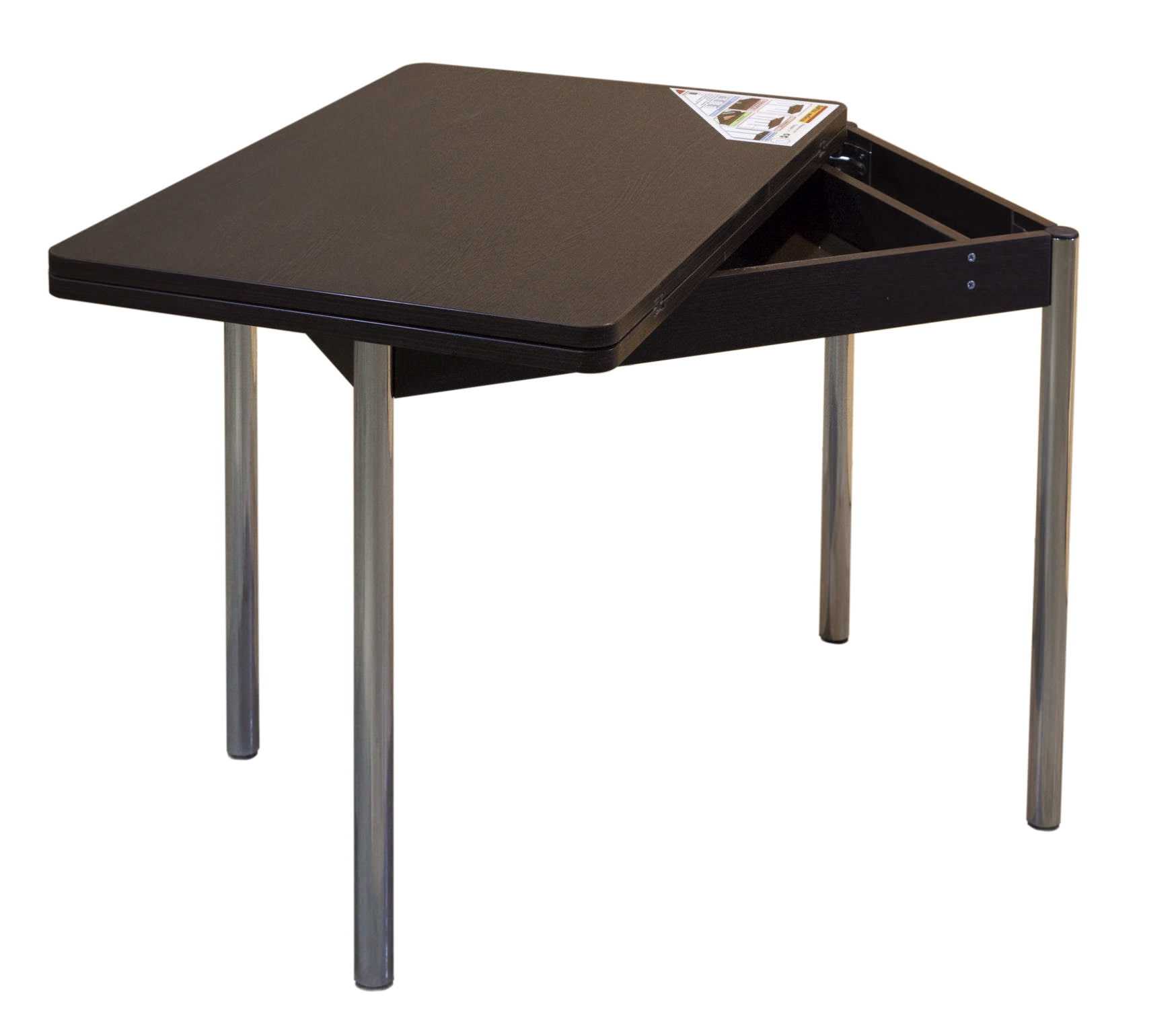 У второго вида, как в случае с раздвижным типом, элементы раздвигаются в противоположные стороны для увеличения полезной площади. Конструкция состоит из 2 деталей: главной и дополнительной. Одна располагается над другой и остается незаметной. Круглых столов с таким механизмом нет. На рынке представлены квадратные или прямоугольные модели, но есть возможность подобрать варианты с закругленными краями.