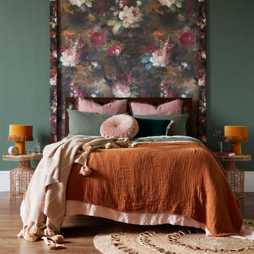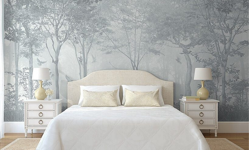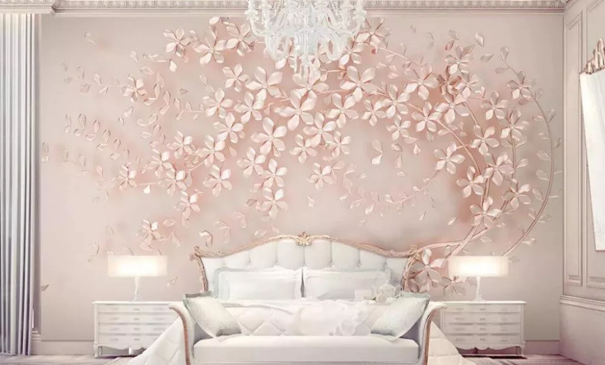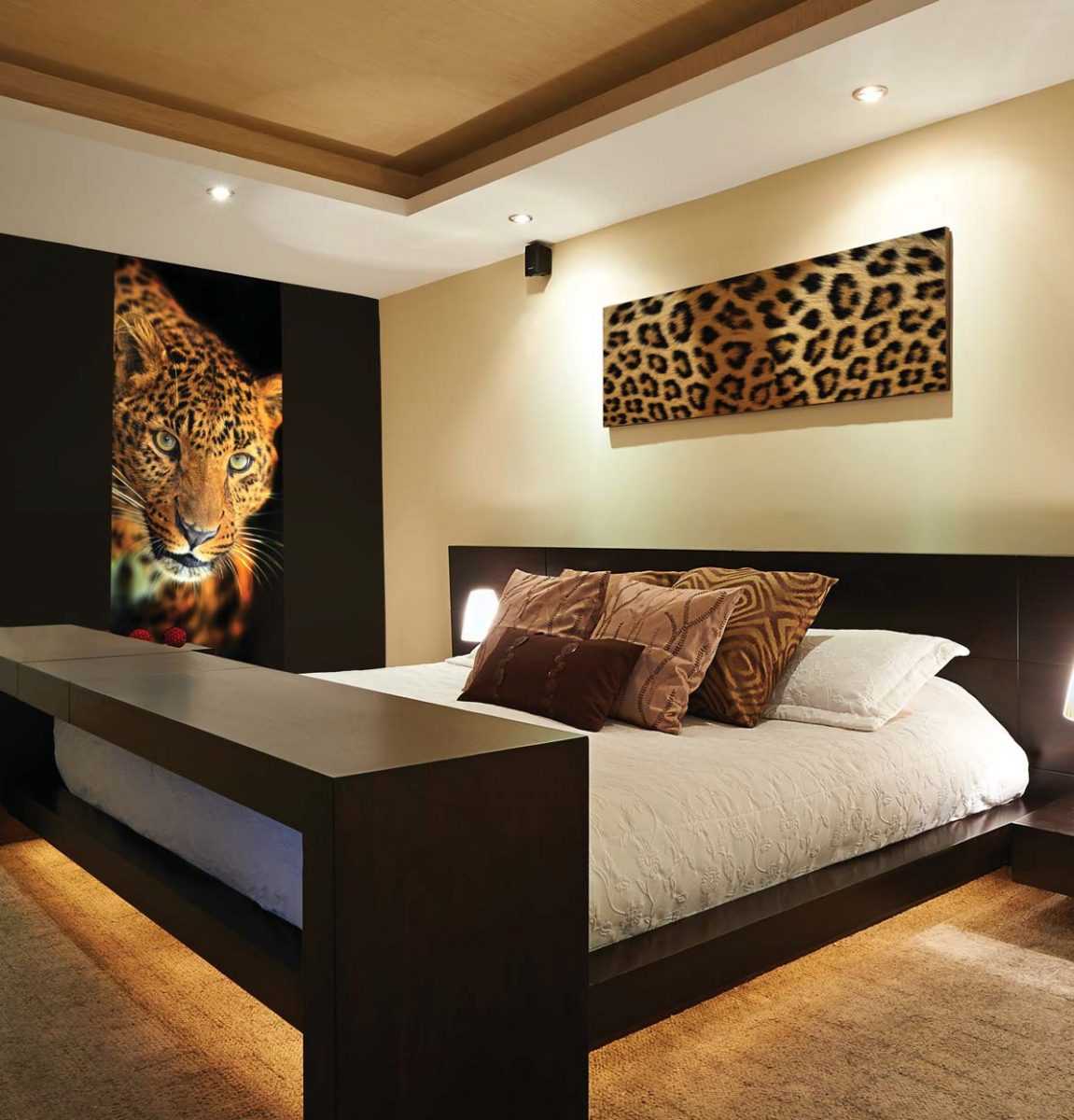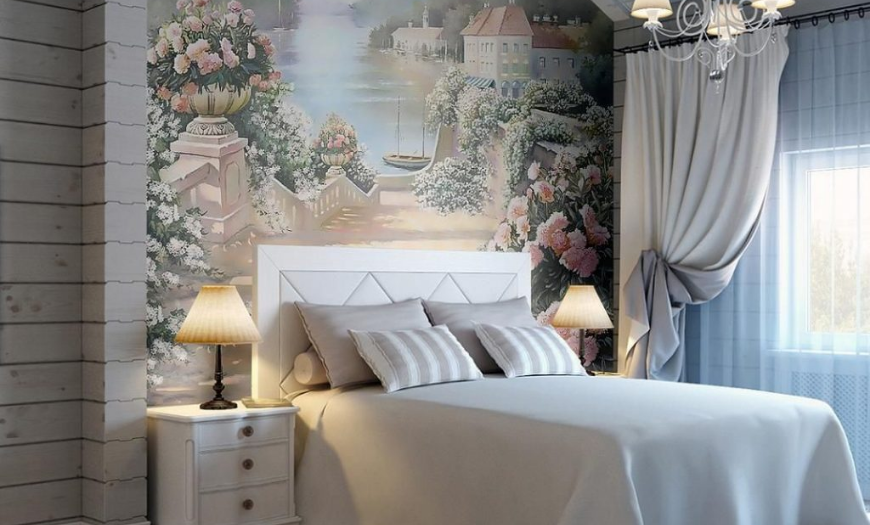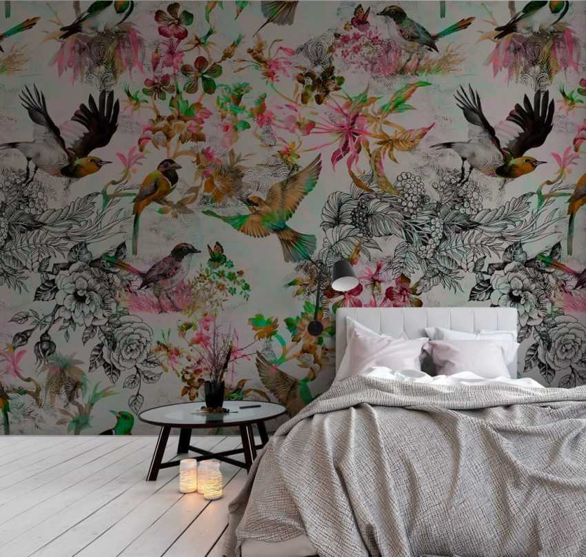 Природные мотивы. Особенно красиво такие полтона смотрятся благодаря естественности изображения, глубине цвета на рисунке. Тем более если речь идёт о фотообоях. Если же работаем просто с растительными и природными орнаментами (цветы, ветки растений, фигуры животных), то они вообще отлично подходят оформлению спальни.