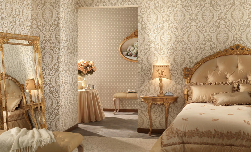 Стеновые покрытия в классическом стиле – идеальный вариант для малометражной спальни. В качестве доминирующего цвета рекомендуется использовать серый, приглушенный коричневый или бледно-розовый. Дополнить основной колер можно золотистыми, серебристыми узорами и черным глянцем.