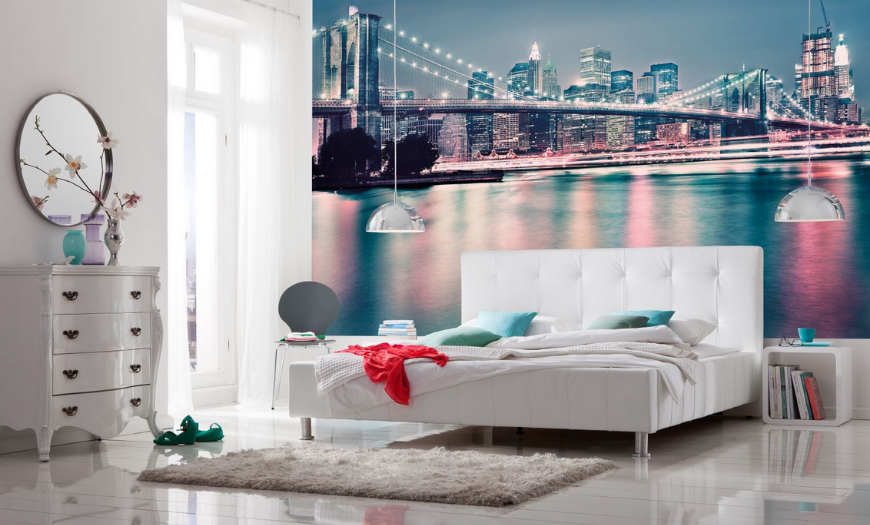 Дизайн спальни с фотообоями выглядит свежо и неизбито. Но такое декорирование стен имеет как преимущества, так и недостатки. Полный каталог фотообоев смотрите на сайте Picwalls.ru.