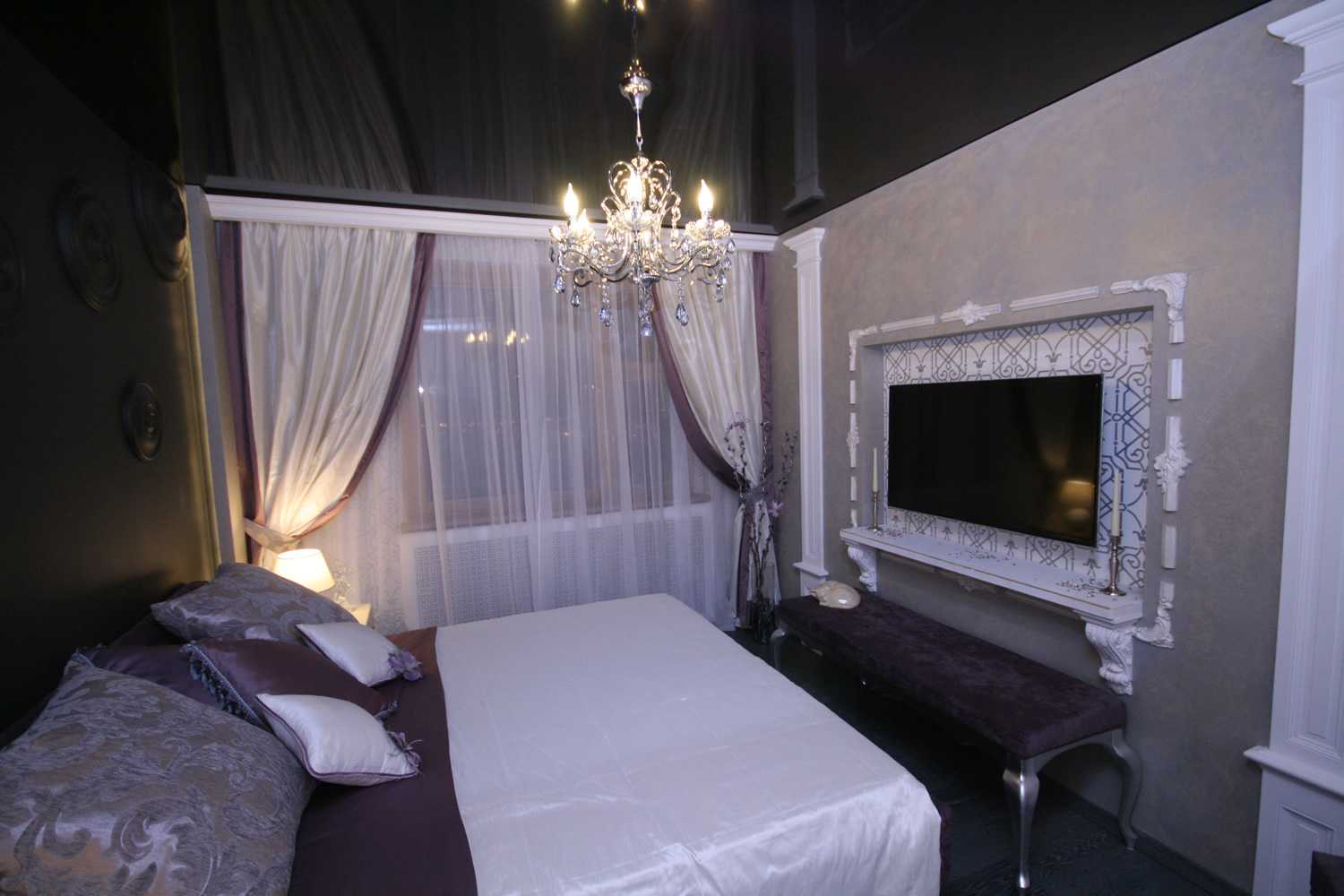 Небольшая комната не выглядит мрачной и тесной, если сочетать цвета и фактуры так, чтобы визуально расширить пространство. Глянцевый черный потолок за счет зеркального отражения и блеска будто увеличивает помещение в высоту. Светлые стены в комбинации с черным потолком и мебелью зрительно расширяют спальню.