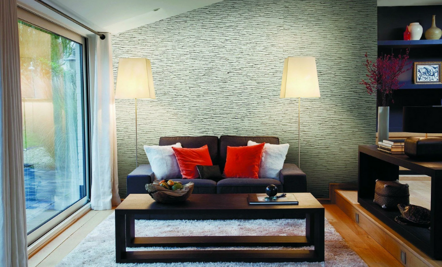Интересными покрытиями можно украсить акцентную стену. Этой стеной можно сделать зону, где стоит диван или расположен телевизор. Здесь также можно орнаментальными обоями украсить ниши или использовать покрытия с декоративной печатью или нанесенной фреской для создания роскошного панно.