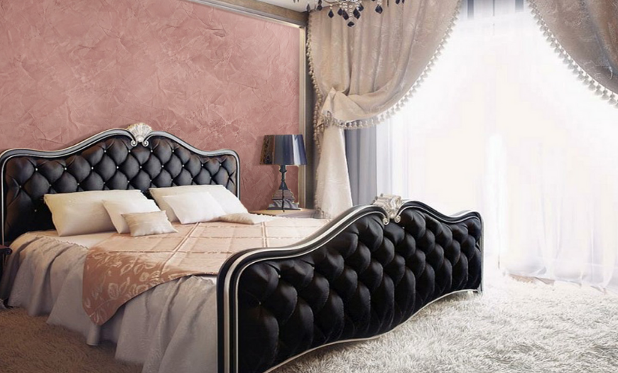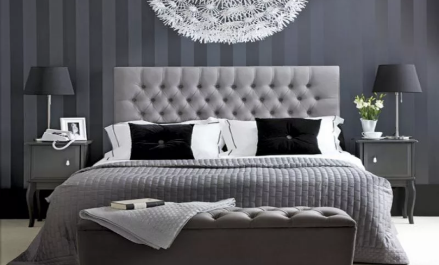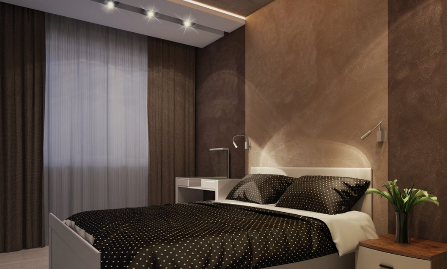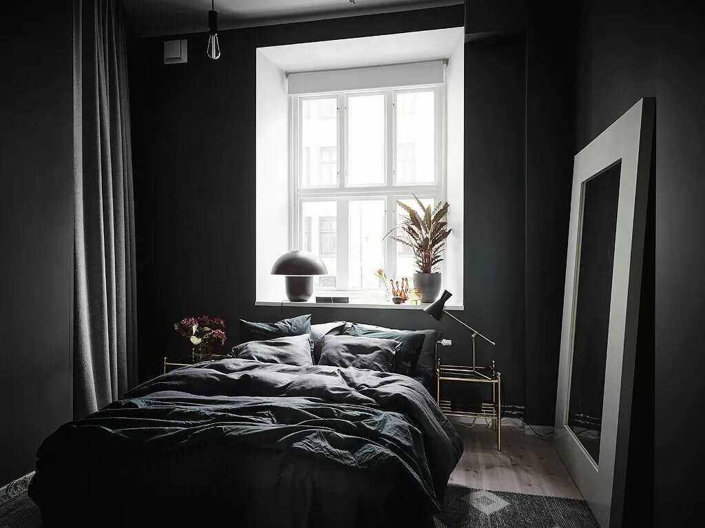 В маленькой спальне может преобладать и черный. Это вариант для любителей небольших помещений, в которых они чувствуют себя уютно и в безопасности. Если же в маленькой черной спальне хочется расширить пространство, сохранив доминирование темного, на стенах рисуют монохромные картины-обманки с эффектом перспективы. Также используют геометрические узоры, уходящие вдаль. Так тесное помещение воспринимается более просторным.
