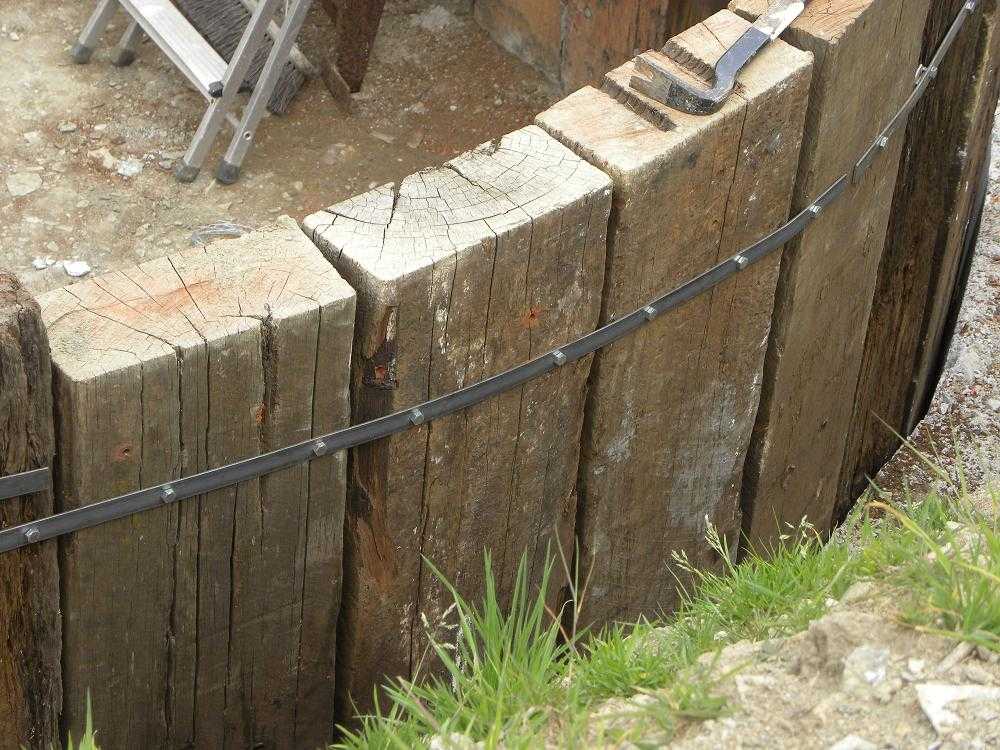 Для возведения кладки из дерева вырывается траншея, дно которой на 10 см покрывается дренажной подушкой. Затем бревна наполовину своей высоты устанавливаются внутри рва, закрепляются друг к другу при помощи проволоки и гвоздей и засыпаются гравием и щебнем для устойчивости. Можно применить и горизонтальную кладку.