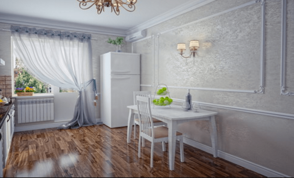 В кухне молдингом идет отделка мебельного гарнитура. Красиво смотрится белая отделка на светлом фоне. Для этого используют мебельные планки различной ширины. Они легкие, монтируют их с помощью водостойкого клея.