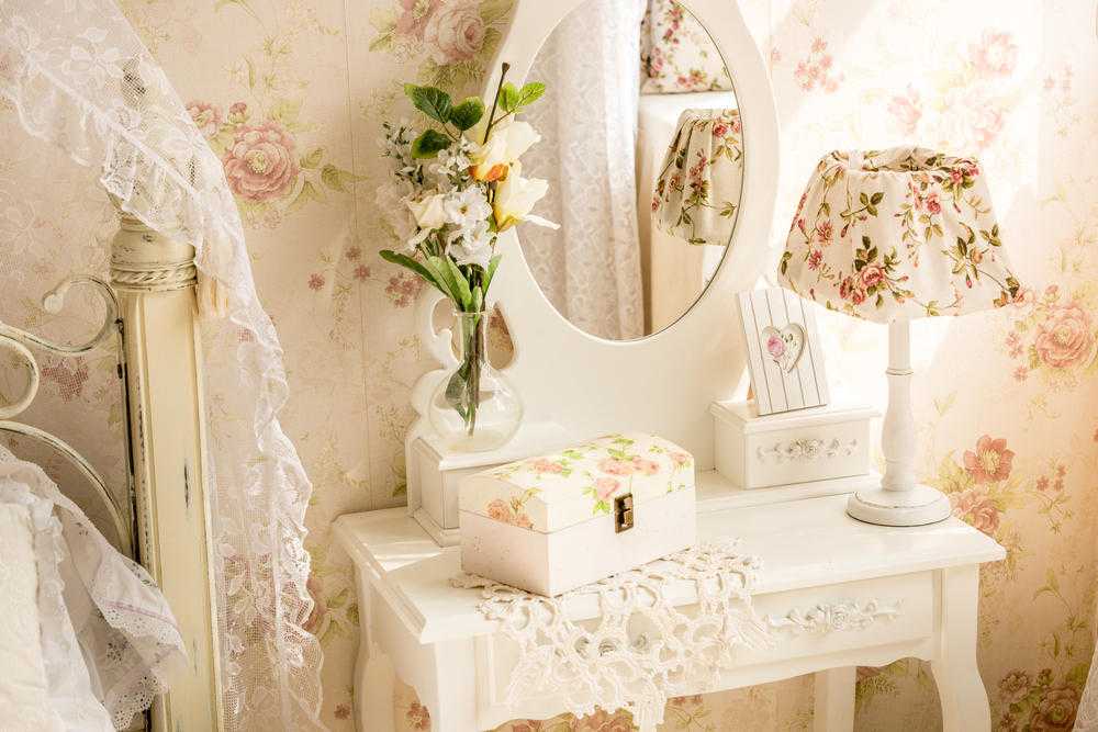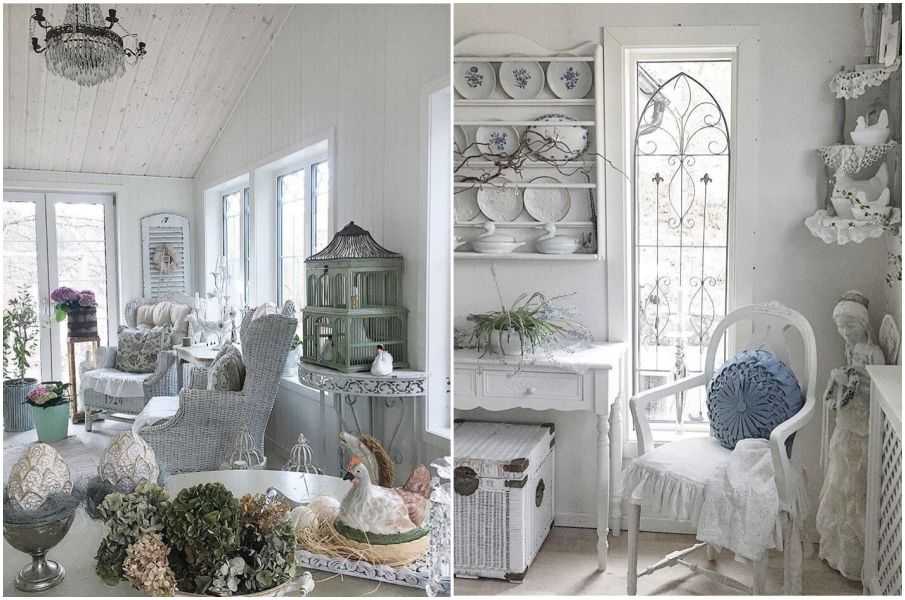Для украшения интерьера подбирают романтичные аксессуары и вещи ручной работы в виде деревянных расписных шкатулок, резных подставок, изящных фарфоровых статуэток, корзинок, глиняных и керамических ваз, ажурных рамок для фотографий, а также букетов из засушенных растений или живых цветов. Благодаря декоративному оформлению получается придать обстановке неповторимого сельского колорита.