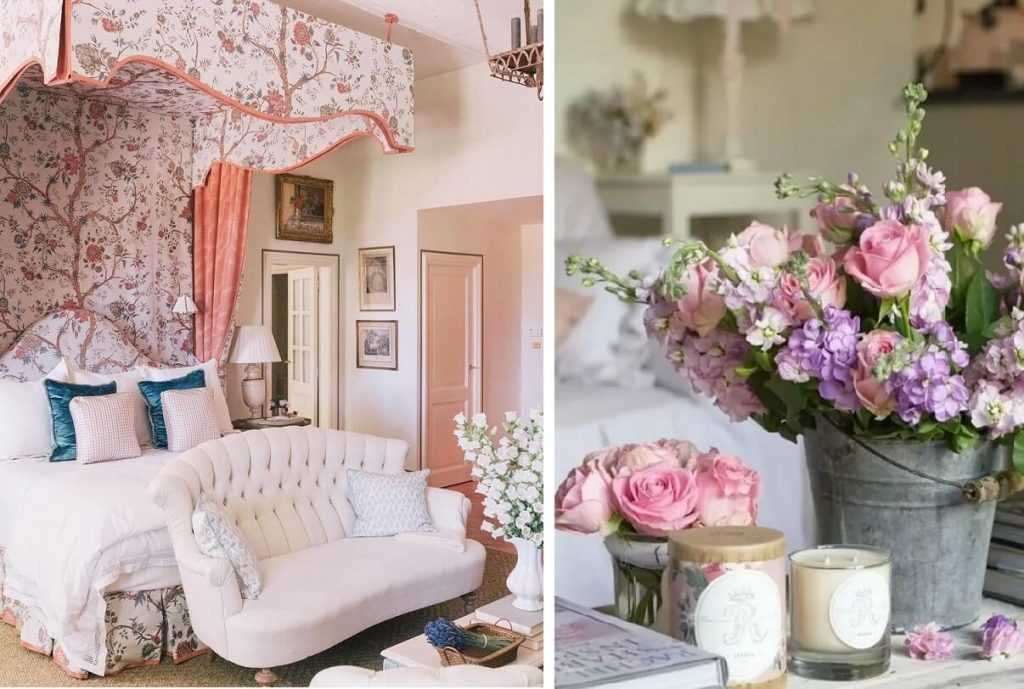 Множественность цветочных мотивов отличает интерьер в стиле Прованс от схожих ему интерьерных стилей. Малое количество цветочных композиций в интерьере мастера восполняют за счет цветочного орнамента на обоях, шторах, коврах, на поверхности мягкой мебели, на постельном белье и изображений на настенном панно. Если же комната перенасыщена цветами, то не рекомендуется злоупотреблять вспомогательным цветочным орнаментом.