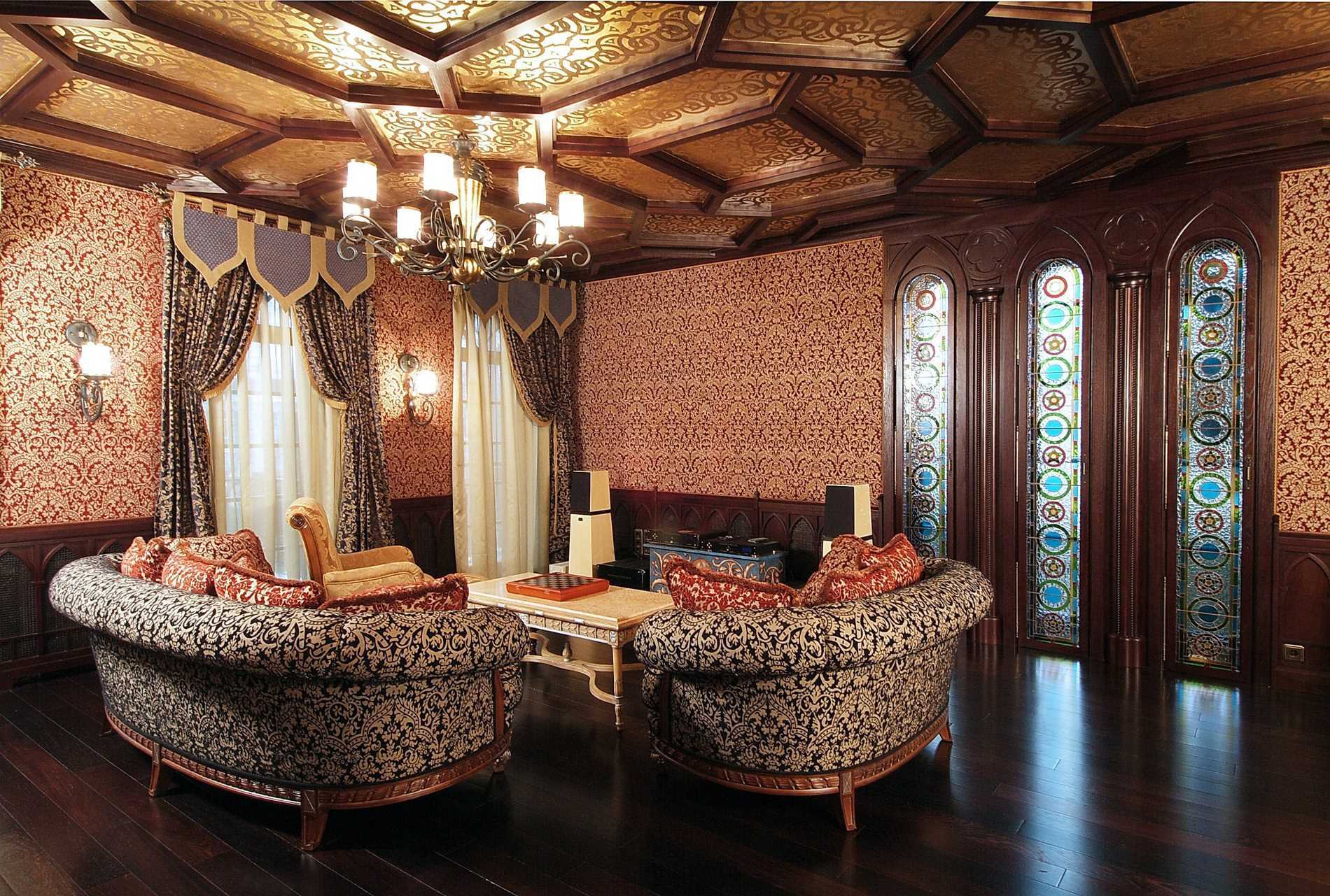 Восточный интерьер отличается плавными, мягкими формами с нанесенной на них росписью. Потолок может быть подвесным, иметь несколько уровней, популярно использование декоративных накладок с разнообразной имитацией.