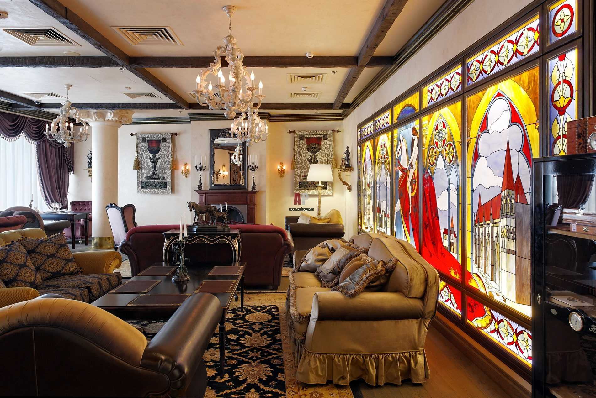 Гостиная в романском стиле с небольшими скульптурами и витражными вставками