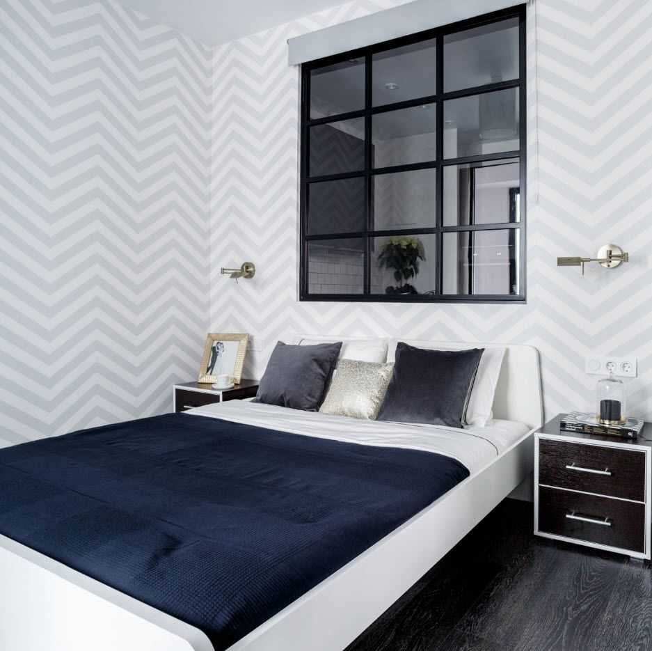 декорирование обоями с узором у изголовья;