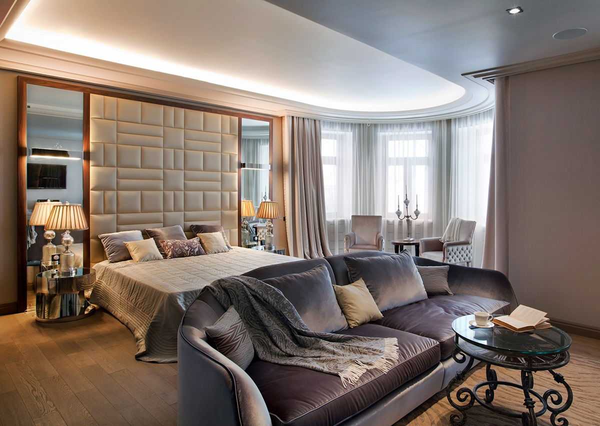 Натяжные и подвесные потолки – признаки современной трактовки стиля. Местная подсветка или освещение по периметру насытит интерьер элегантностью и уютом, а несколько уровней визуально прибавят комнате высоты.