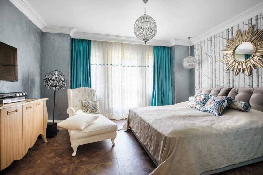 Полосатый ковёр может плавно перетекать своей расцветкой на боковую плоскость, способствуя красивому интерьеру. Красные розы, распустившиеся над головой, и такое же одеяло – необычайно трогательный дуэт. Серая спальня с яркими акцентами смотрится потрясающе нежно с бирюзовой стеной.