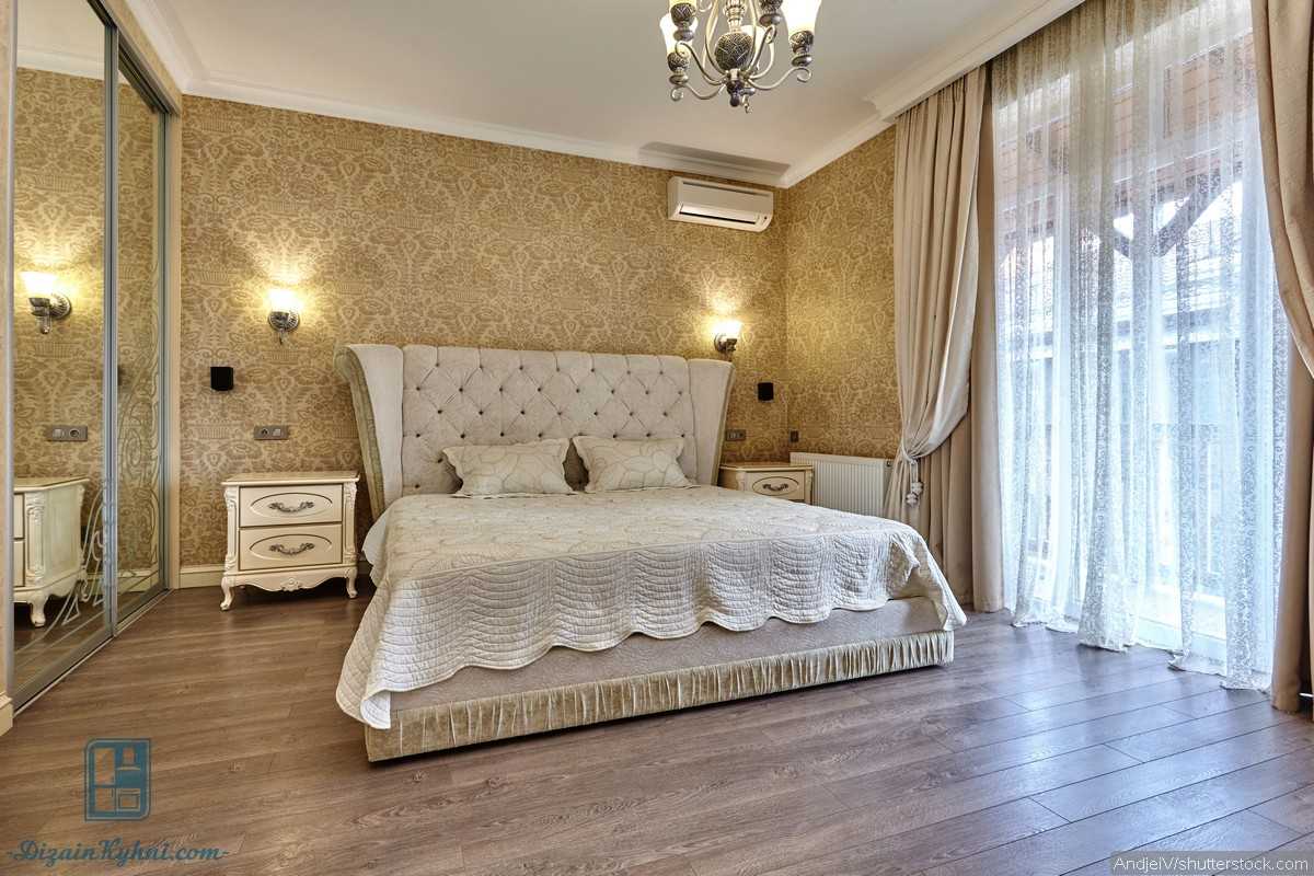 Достаточно прост в исполнении, но выглядит элегантно и удобно. Оформление помещения выдерживается в спокойных цветах, где преобладают бежевый, коричневый и золотой. Такая спальня предназначена исключительно для отдыха.