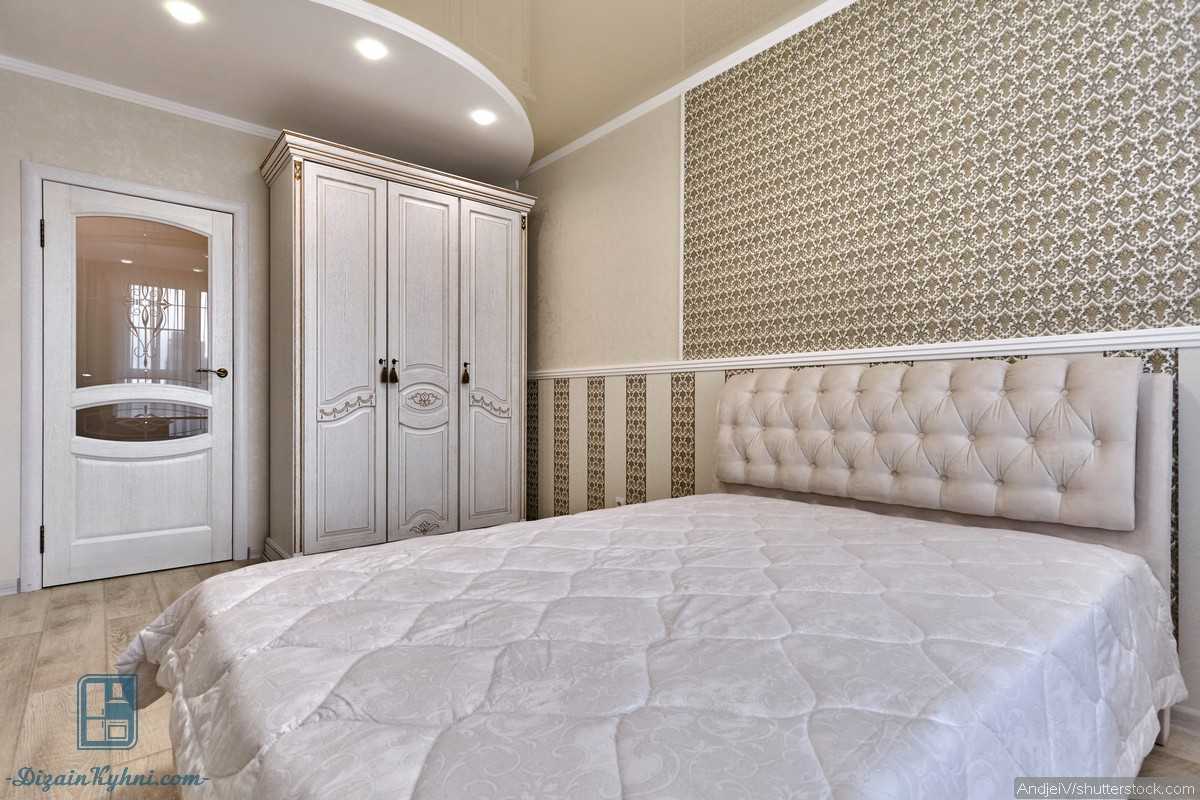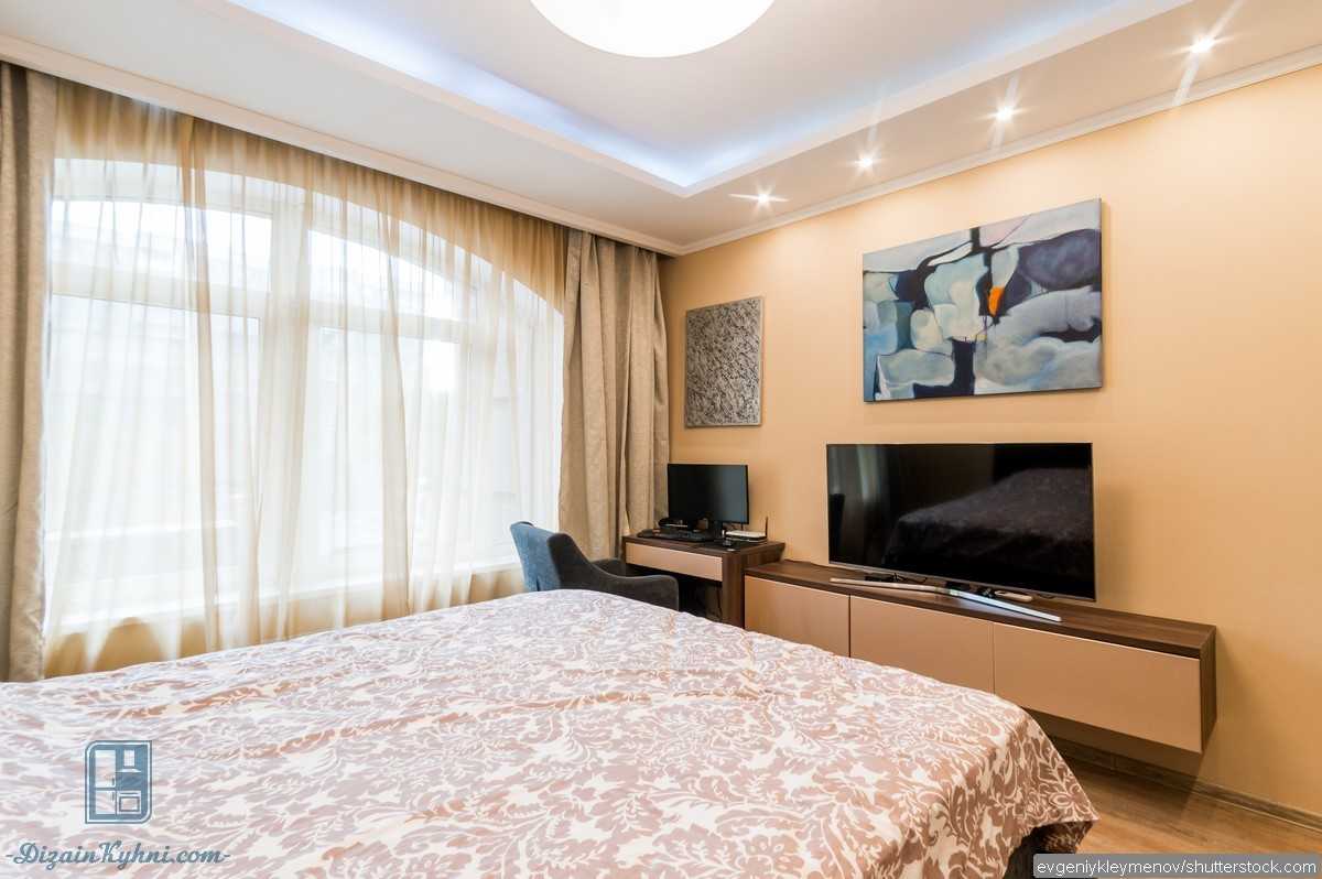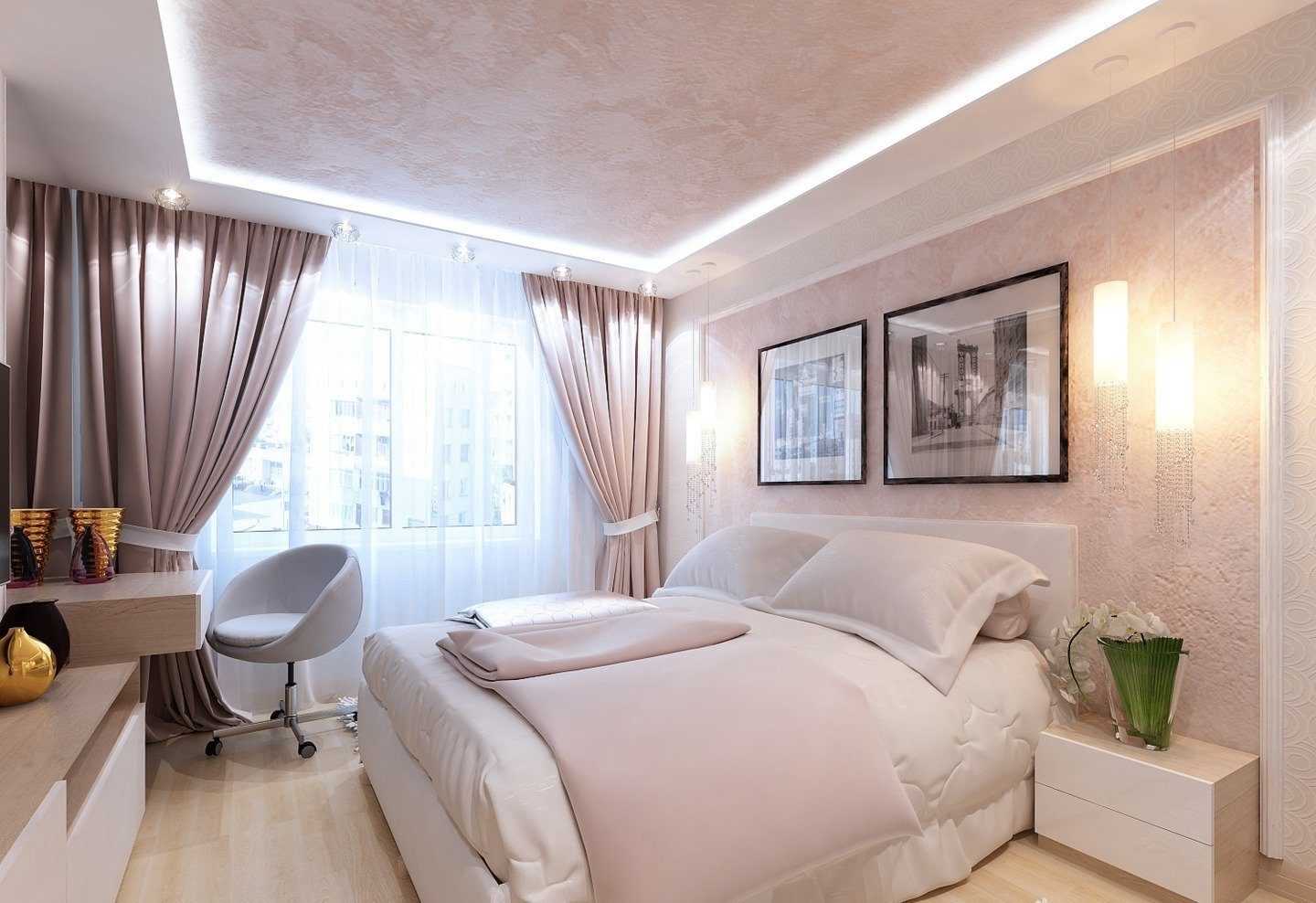 В спальне уместно использование потолочных подвесных или натяжных конструкций. Более светлый и гладкий одноуровневый потолок, дополненный с помощью легких карнизов и встроенных светильников, придаст малогабаритной комнате визуального простора.