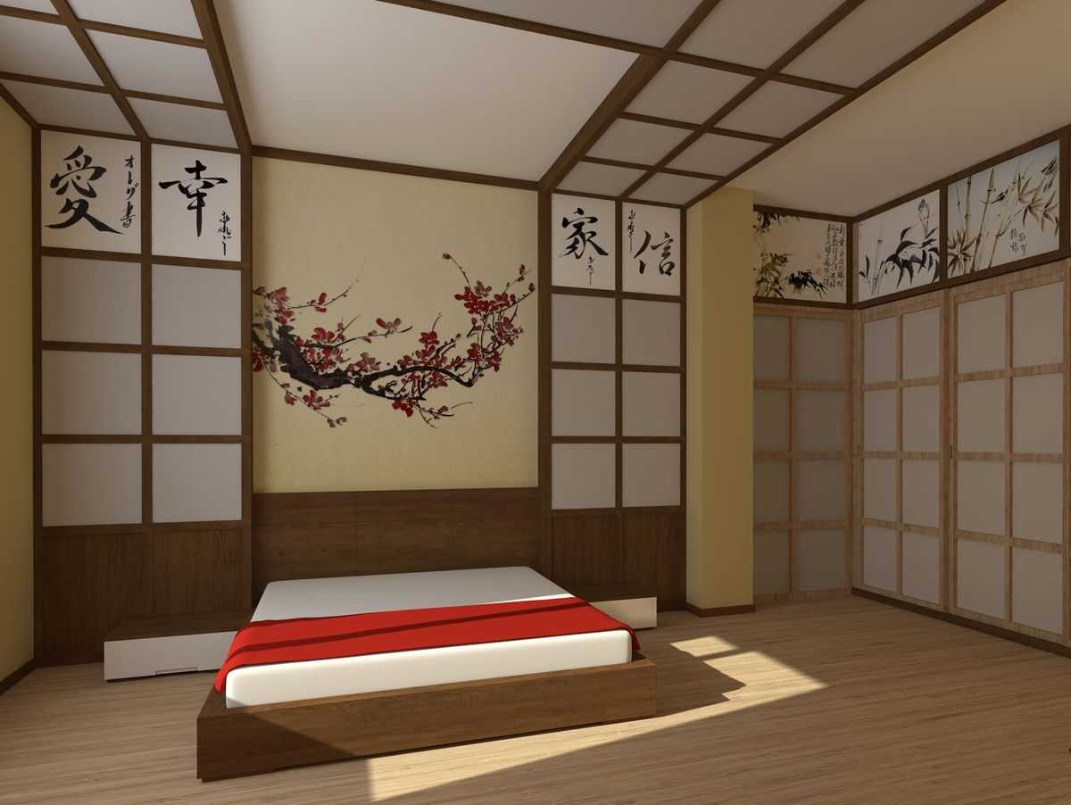 В нем преобладают натуральные цвета, в особенности коричневый цвет и его оттенки. Стиль прост и функционален, без лишних декоративных элементов. Разбавить теплую монотонность можно картиной с японской живописью, веером или парочкой статуэток.