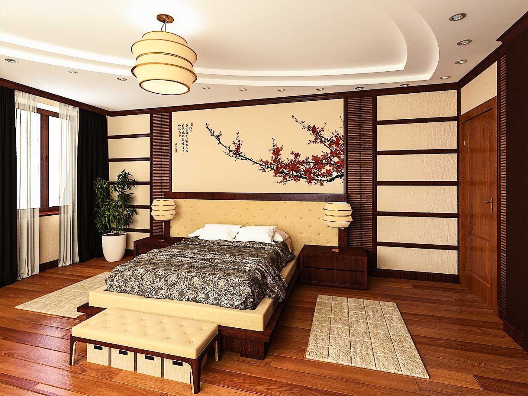 Светильники выбирать объемные, шаровидной или прямоугольной формы. Мебель также лучше выдерживать в стиле: низкая кровать, миниатюрные столики, перегородки. Потолок украшается деревянными перекладинами, в которые можно установить световые приборы. В такой спальне должно быть много открытого пространства. Вместо штор на окна устанавливаются жалюзи или японские шторы. Японский стиль предпочитают люди, склонные к духовным практикам и погружениям в собственные мысли.