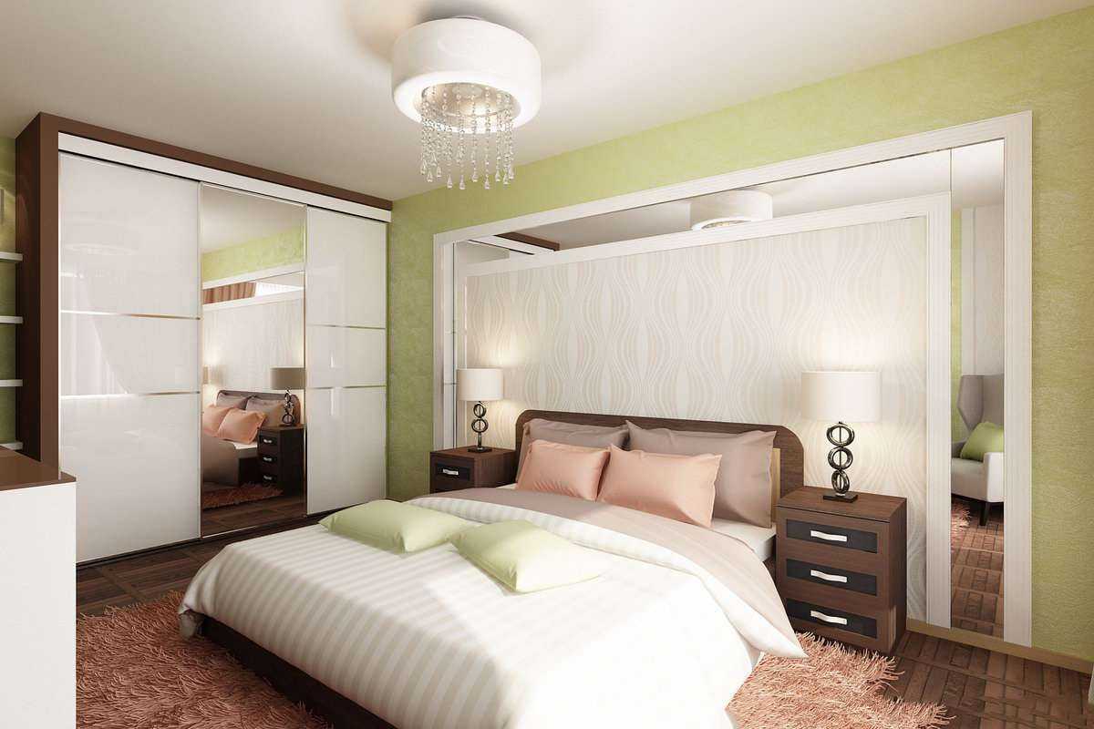 Визуально расширить маленькую комнату в хрущевке, можно за счет полосатых зеленых обоев или полотен с мелким рисунком в сочетании с одной акцентной стеной, украшенной крупными узорами. Также отличным решением станут фотообои, которыми в основном облицовывают стену в изголовье кровати.