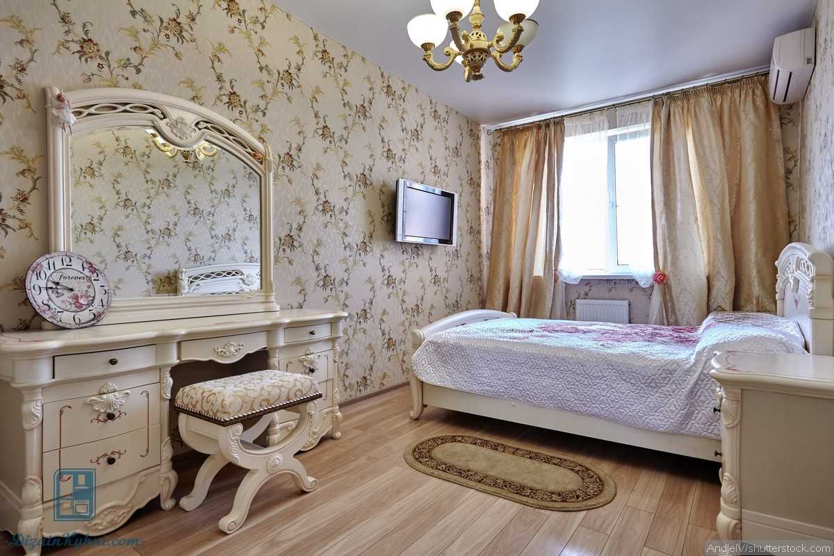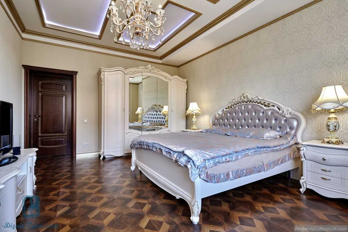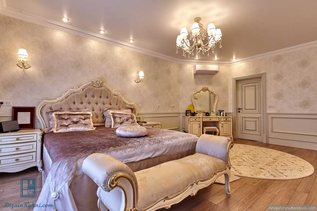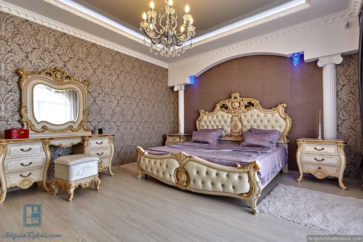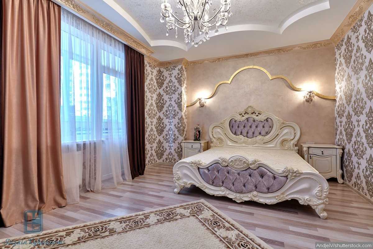 Роскошный стиль с вычурными элементами мебели и декора. В оформлении используются теплые тона, в частности, золотой. Обои используются с мелким рисунком, не выделяющиеся из общего цвета. Искусно сделанная лепнина украшает потолок, на котором располагается пышная стеклянная люстра. Изголовье кровати, зеркало, прикроватная банкетка, столы напоминают о временах царей и цариц. Наслаждаться отдыхом в такой спальне смогут любители настоящего лоска.