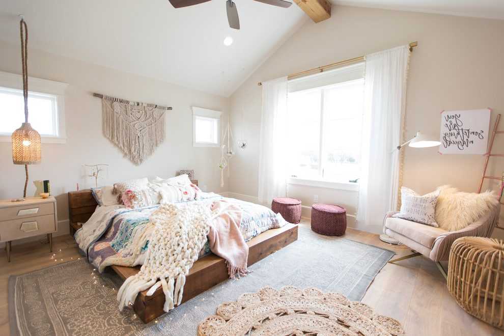 Стиль, который создает максимальный уют в спальне и богат на теплые оттенки цветов. Светлые стены, старинная потертая мебель, яркий декор — характерные детали бохо. Украшениями служат свечи, макраме, перья, плетеные корзинки, подушки. Текстиль имеет разную фактуру, сочетает легкое и тяжелое. Если правильно выбрать и скомбинировать многочисленные элементы стиля, вы создадите колоритный интерьер, а грамотно расставленные предметы не создадут ощущения захламленности.