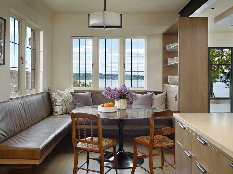 На этом фото диван-кушетка в интерьере маленькой кухни в современном стиле