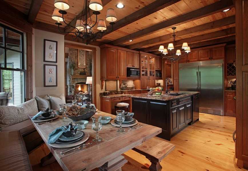 Присутствие на потолке деревянных балок – одно из ключевых особенностей стиля кантри на кухне.