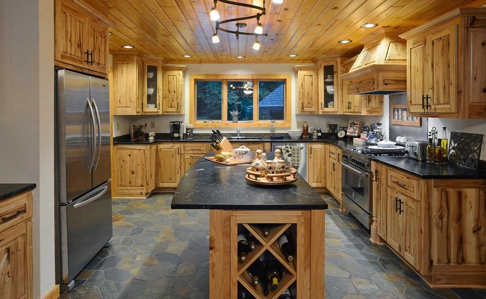 Половую поверхность просторной кухни в загородном доме можно облицевать камнем натурального или искусственного происхождения. Подобная отделка полностью отвечает концепции кантри стиля. Минус решения – большой вес материала, сложности при транспортировке, трудоемкость и длительность работ по укладке. К тому же камень обладает высокой теплопроводностью и не подходит для кухни в северной широте, ведь зарождение стиля кантри началось на теплом американском континенте. Но конечный результат дизайна кухни с применением камня поражает своей эффектностью.