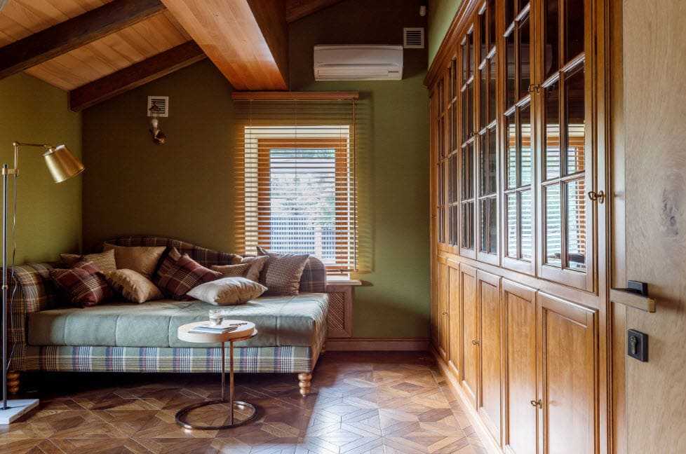Здесь обычно настилают полы из массивной доски, стены обшивают деревянными панелями, штукатурят, красят или оклеивают бумажными обоями.