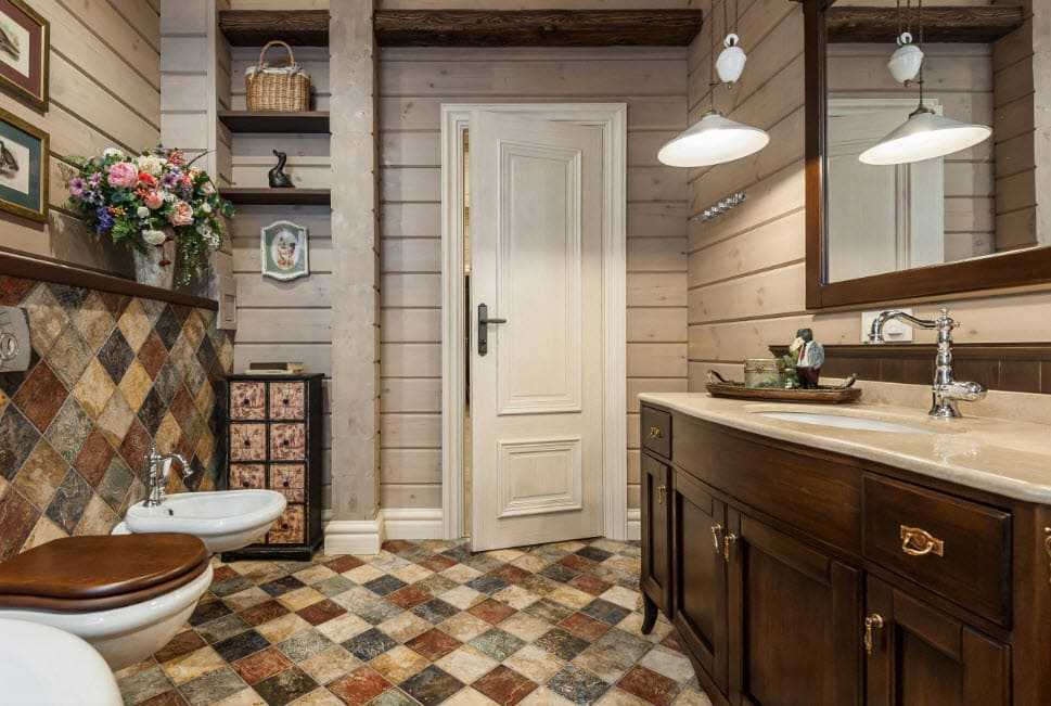 Как уже говорилось ранее, при создании интерьера в этом стиле принято использовать натуральные и экологически безопасные материалы. Лидером среди дизайнеров служит древесина, которую применяют для отделки пола и потолка, производства мебели и создания декоративных элементов. Чаще всего специалисты выбирают грубое дерево, покрытием которого может служить только лак и то в редких случаях, так как материал должен сохранять натуральный теплый оттенок.