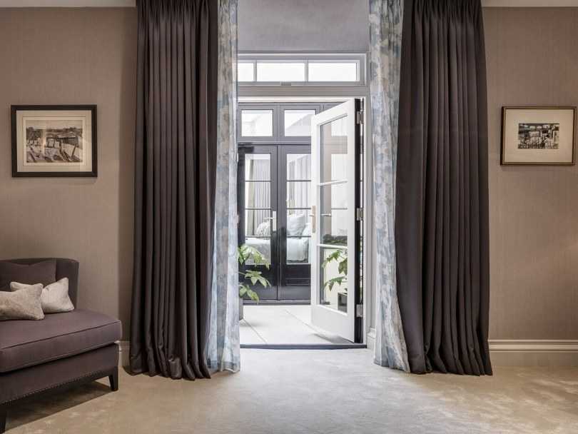 Для восточного или классического интерьера выбирают шторы из тяжелых натуральных тканей. Часто их дополняют сложной драпировкой и ламбрекеном. Сбоку от двери размещают красивое металлическое крепление для подхватов.
