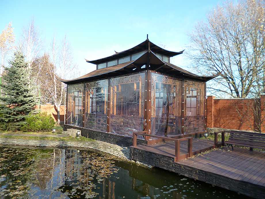 Защитные шторы для беседки из ПВХ могут быть полупрозрачными или полностью прозрачными, имитируя стекло как внешне, так и по свойствам, но существенно уступая ему по стоимости. Прозрачная пленка способна пропускать до 90% солнечного света, поэтому внутри помещения всегда будет светло, комфортно. Подобные конструкции часто именуют «мягкими окнами», поскольку визуально шторы напоминают остекленную веранду.