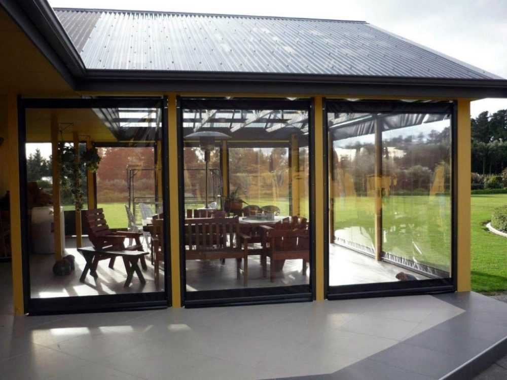 - Существует раздвижная система управления полотном. Выглядит она в виде традиционного раздвижного механизма, управляемого при помощи роликов, движущихся по направляющей. Герметичной защиты такая система не обеспечит. но зато создаст красивый внешний вид строения. Ее часто можно встретить при оформлении большой террасы или павильона с достаточной протяжённостью конструкции.